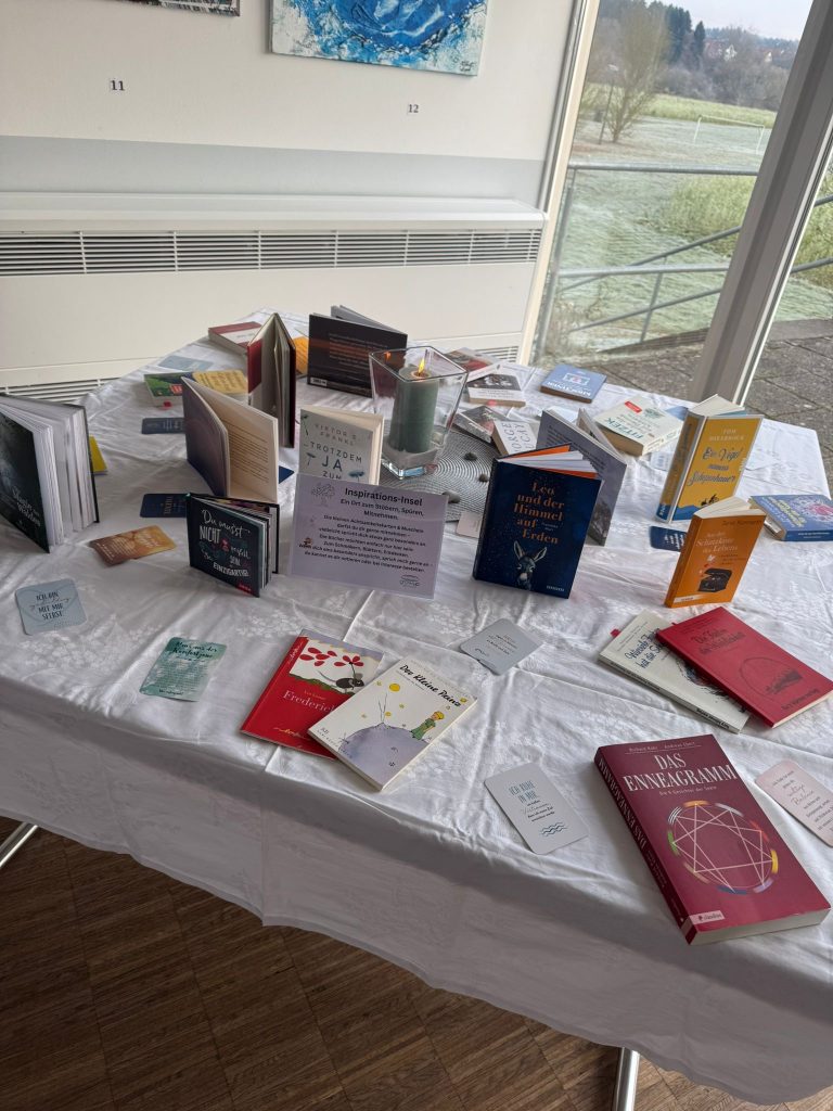 Eine kleine Oase voller Impulse: inspirierende Bücher, Affirmationskärtchen, kleine Botschaften zum Mitnehmen.